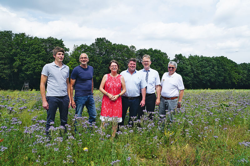 Reges Treiben herrschte vergangenen Freitag auf dem Blühstreifen von Hartmut Lang in Hüttenberg-Rechtenbach. Tausende von Bienen, Hummeln und anderen Insekten waren im bunt blühenden Feld unterwegs. Von den ersten Erfolgen der Gemeinschaftsinitiative „Hessens Landwirtschaft blüht für Bienen – Landwirte und Imker sind Partner“ konnten sich am Feld von Hartmut Lang neben Thomas Kunz, Vizepräsident des Hessischen Bauernverbandes und Landwirtschaftsministerin Priska Hinz, Ernst Ruppel, Vorstandsmitglied des Landesverbandes Hessischer Imker, und weitere Besucher überzeugen.