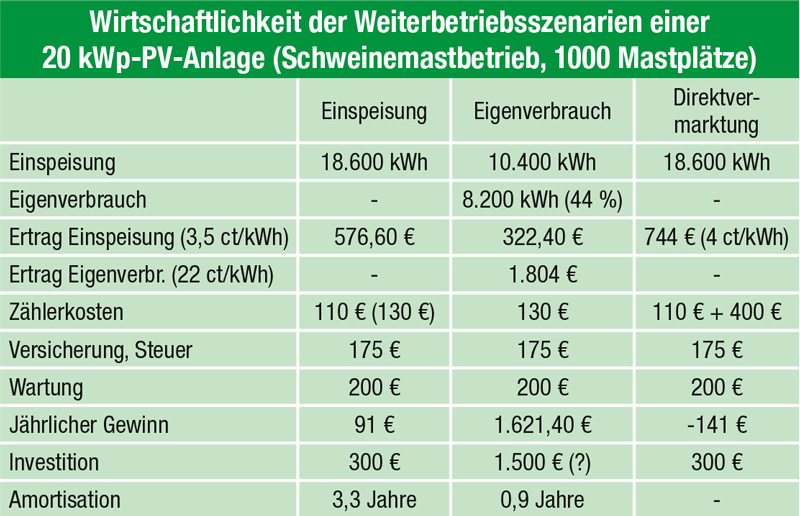 Einen Vergleich der Weiterbetriebsmöglichkeiten einer 20- kWp-Photovoltaikanlage in einem Schweinemastbetrieb mit einem Stromverbrauch von 20 000 kWh ist in der beigefügten Tabelle dargestellt. In allen Weiterbetriebsszenarien ist die technische Eignung der Anlage für diesen vorher durch eine Fachperson zu überprüfen.