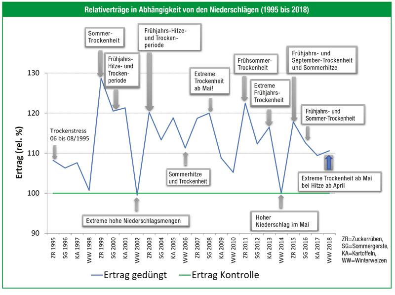 In einem Langzeitversuch auf einem Trockenstandort in Thüringen konnte die Ertragswirkung einer Kaliumdüngung eindrucksvoll belegt werden (Grafik). Die Ertragseinbußen in den Trockenjahren wurden durch optimale Versorgung mit Kalium und Magnesium abgemildert. Dargestellt sind die relativen Erträge der Kontrolle (100 Prozent-Linie) im Vergleich zu den gedüngten Varianten.Die höchsten Ertragsunterschiede ergaben sich erwartungsgemäß bei den Kalium-bedürftigeren Blattfrüchten in den Jahren mit Trockenheitsereignissen (1999 Zuckerrüben +28 Prozent, 2001 Kartoffeln +22 Prozent, 2011 Zuckerrüben +23 Prozent, 2015 Zuckerrüben +18 Prozent). Bei hohen Niederschlägen und Anbau von Getreide sind die Unterschiede dagegen nur marginal.