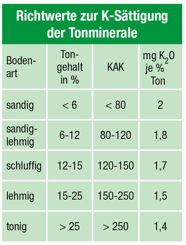 Eine bedeutende Kultur als Indikator von Kaliummangel ist der Raps, bei dem erste Anzeichen bereits im Herbst auftreten. Herabhängende, nach unten gewölbte Blätter weisen auf den reduzierten Turgor hin. Vom Rand her beginnen sich die Blätter gelb zu verfärben. Im Idealfall kann ein Teil des Kaliumbedarfs durch die Rücklieferung aus dem Getreidestroh gedeckt werden, in dem etwa 70 Prozent des Anteils gebunden sind. Unter Einwirkung von Feuchtigkeit schreitet die Zersetzung zügig voran. Fehlt jedoch das Wasser, muss der Bedarf mineralisch ausgeglichen werden, da sich Kaliummangel bei Trockenheit besonders stark auswirkt.Das K+-Ion ist nur zu einem geringen Teil im Bodenwasser gelöst. Der größte Teil ist an negativ geladene Tonminerale gebunden. Je trockener der Boden ist, desto stärker wirkt deren Anziehungskraft. Das ist der Grund, warum Kaliummangel sehr oft auf tonhaltigen Böden auftritt. Wie hoch die Kaliumversorgung der Böden sein sollte, hängt von deren Sorptionsfähigkeit ab. Je tonreicher ein Boden ist, umso mehr kann er Kalium binden. In Trockenphasen ist es wichtig, dass die Austauscher (Tonminerale) möglichst gesättigt sind. Richtwerte für die Versorgung sind in der Tabelle dargestellt.