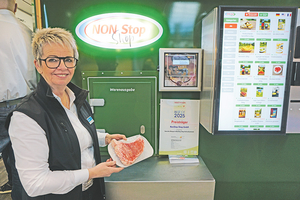 Für die geeichte Waage im NonStop Shop, einem großen Container-Verkaufsautomaten, der Platz für 430 Produkte bietet, wurde der Innovationspreis 2025 der expoDirekt verliehen. Mit der Waage kann der Kunde lose Ware, beispielsweise Fleisch, Spargel oder Erdbeeren, unmittelbar vor der Ausgabe wiegen. Damit spart der Betreiber Zeit, da er die Ware nicht selbst etikettieren muss. „Außerdem müssen keine Verdunstungsmengen berechnet werden“, so Vertriebsmitarbeiterin Sabine Bruns, Meppen. Sie erklärte: „Um beispielsweise 500 g Erdbeeren an den Kunden zu geben, müssten acht bis zwölf Gramm dazukalkuliert werden. Die sind vom Betreiber quasi verschenkt. Diese Verluste werden mit der Waage eliminiert. Für den Kunden und den Betreiber wird grammgenau abgerechnet. Fix und fertig kostet unser Verkaufsautomat mit geeichter Waage 50 000 Euro netto.“