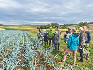 Auf einem Rundgang über den Betrieb berichtet Betriebsleiter Andreas Backfisch von seinen Erfahrungen mit Mulch, den er nicht nur für den Versuch mit Porree anwendet, sondern auch bei anderen Gemüse-Kulturen wie der Zucchini.