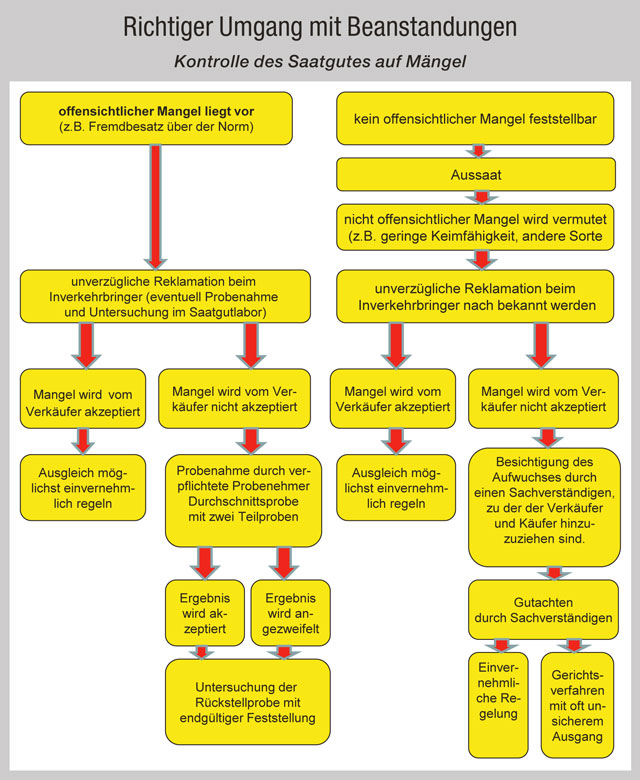 Bei schlechten Feldaufgängen ist unverzüglich der Vorlieferant zu informieren und in Kenntnis zu setzen. Ist noch verschlossenes Saatgut vorhanden, kann hieraus eine Probe entnommen werden. Ist kein Probenahme und keine Einigung mit dem Vorlieferanten möglich, muss ein vereidigter Sachverständiger den Schaden bewerten und ein gerichtsverwertbares Gutachten erstellen. Es wird empfohlen, dass bei der Begutachtung der Fläche alle Beteiligten zugegen sind.
