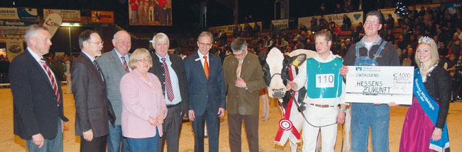 Vor der Siegerehrung kam es auch dieses Jahr zum Finale für die ausgestellten Bullen, die sich dem Urteil der beiden Preisrichter stellten und um den Titel Hessenchampion 2014 konkurrierten. Sicherlich hatten viele Zuschauer ihren persönlichen Favoriten ausgemach. Mit viel Applaus unterstützt wurde die begehrte Schärpe dem Angussieger Ontario aus der Zucht von Werner und Maria Klausmann aus Abtsteinach umgehangen, der für das Preisrichterduo an diesem Tag die optimale KombiÂnation an Rassetyp, Harmonie und Fleischansatzvermögen darstellte. Damit ging der begehrte Titel zum zweiten Mal an diesen aktiven Zuchtbetrieb im Odenwald, der über Jahre hinweg mit erstklassigen Schautieren immer wieder beim Fleischrindertag Präsenz zeigte.
