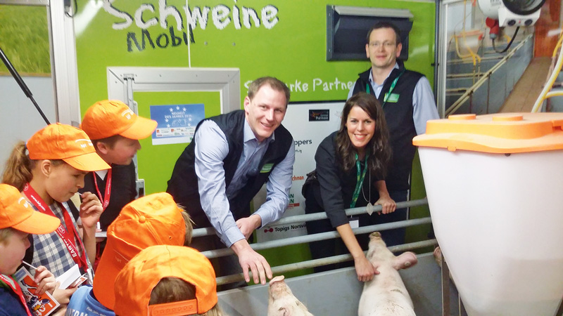 Hennig: Unsere Aufgabe war, uns sichtbar auf dem Erlebnisbauernhof zu verteilen. Ich habe mich hauptsächlich am Schweinemobil aufgehalten, eine gute Plattform, um mit Besuchern ins Gespräch zu kommen. Ich hätte es nie für möglich gehalten, aber aus viel anfänglicher Skepsis unserer konventionellen Schweinehaltung gegenüber, wurde nach meinen Erläuterungen viel positives Umdenken. Der Großteil der Besucher kam noch nie mit einem modernen MastÂschweiÂneÂstall und unserer Arbeit in Berührung. Themen waren: artgerechte Tierhaltung, Schwänze kupieren und Spaltenböden. Ich denke schon, dass einige Besucher mit einer positiveren Einstellung das Mobil verlassen haben.