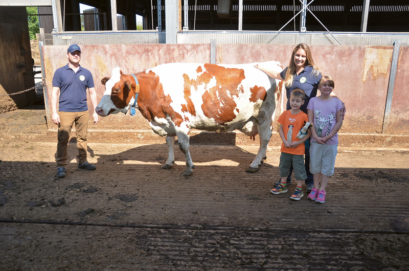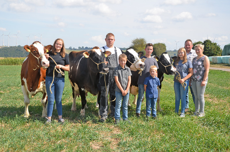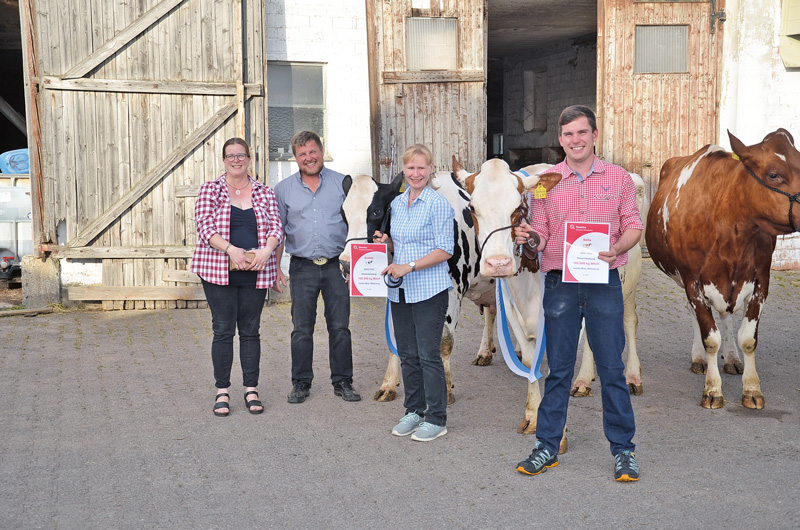Gleich ein ganzes Quartett an 100 000-Liter-Kühen präsentierten kürzlich Bernd und Silja Erlemann auf ihrem Hof in Rhenegge. Die 10 bis 13 Jahre alten Kühe zeigten ein sehr ähnliches Leistungsbild und lagen bei 7 bis 10 Abkalbungen bei 11 000 Liter Milch und durchschnittlichen Inhaltsstoffen in Fett und Eiweiß. Die Väter der vier Kühe Rica GP 82, Fila GP 83, Benny und Fee zeigten mit Diploma, Marmax, Malvoy und Payssli eine beachtliche Streubreite. Dafür waren die Kühe im Typ und Euter vergleichsweise ähnlich, da sie mit gutem Rahmen, sichtbarem Milchcharakter und gleichmäßigen Eutern ausgestattet waren. „Letztendlich“, so Bernd Erlemann, „mussten sich die Kühe im Stall ganz normal beweisen und hatten bei ihren weiblichen Vorfahren auch schon sechs oder sieben Abkalbungen vorzuweisen.“ Einen deutlichen Anteil an diesem besonderen Erfolg sprechen Bernd und Silja Erlemann zweifellos ihrem Fütterungsberater Klaus Boßhammer und dem Innovationsteam Milch Hessen mit Sibylle Möcklinghoff-Wicke zu. Selbstverständlich freuten sich die Kinder Leni, Nila, Moritz und Leo genauso über die Kühe wie die Auszubildenden Rene Schünemann und Peter Osebold. Jetzt hofft das gesamte Team, dass in Zukunft mal wieder 100 000-Liter-Kühe präsentiert werden können, ob nun von den Nachkommen dieser Kühe, die zweifellos in der Herde vorhanden sind, oder aus anderen Linien wird die Zeit zeigen.