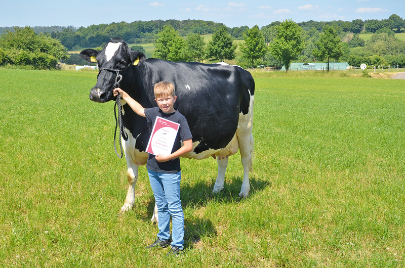 Auf dem Hof der Familie Seipel in Stumpertenrod wurde kürzlich die Windbrook-Tochter SEI Katrysha EX90 präsentiert, die jetzt nach fünf Laktationen mit einer Durchschnittsleistung von 16 611 – 4,06 – 3,26 die 100 000-Liter-Grenze überschritten hat. Sie stammt aus der legendären Goldwin-Tochter SEI Kendra und wurde sogar auf einem bekannten Zuchtbetrieb in Ostdeutschland auf die Welt gebracht. Die sehr exterieurbetont gezogene Kuh mit der Kombination Windbrook x Goldwin x Stormatic gehört zu den leistungsstärksten 100 000-Liter-Kühen generell und liegt mit ihrer mittleren Leistung von 44 kg Milch nach dem Abkalben auf einem außergewöhnlich hohen Niveau. Über zahlreiche Töchter, die auch über Embryotransfer auf die Welt gekommen sind, hat sie ihre Leistungsveranlagung sehr gut weitergegeben, so dass nicht nur auf dem Hof der Familie Seipel in Zukunft Nachkommen von SEI Katrysha zu finden sein werden. Der enorme Körper, vor allen Dingen aber das absolut bestechende Euter dieser Spitzenkuh sind nach wie vor sehr beeindruckend und zeigen die Sicherheit, die in dieser Kuhfamilie sehr gut verankert ist. Deswegen freut sich nicht nur die gesamte Familie Seipel, sondern auch die Kundschaft des Betriebes über die gewaltige Lebensleistung, die diese mehrfach ausgestellte Spitzenkuh jetzt erreicht hat.