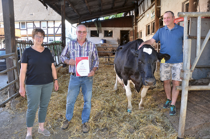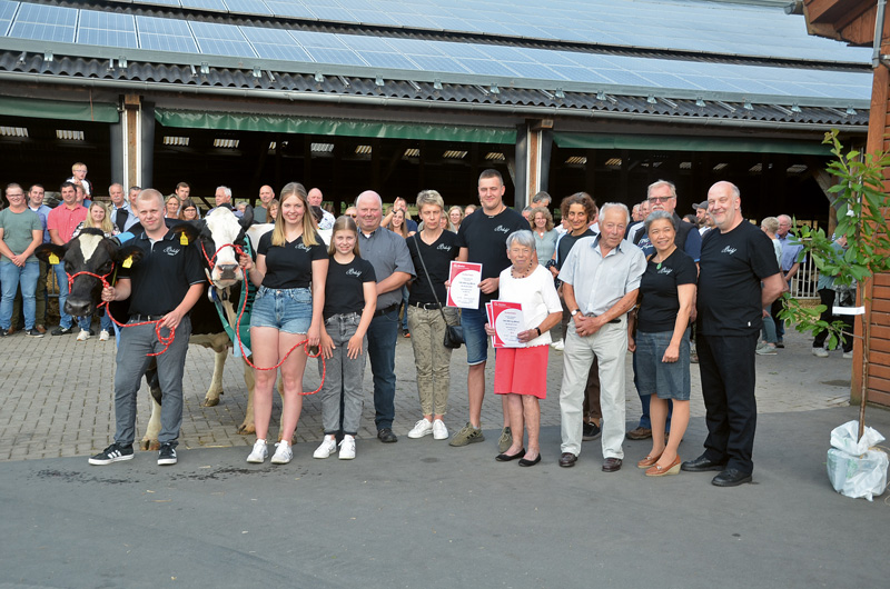 Der Milchviehbetrieb von Willi Gerhard in Wirmighausen, Zollhaus, hat sich schon vor vielen Jahren mit 100 000-Liter-Kühen hervorgetan und konnte vor Kurzem gleich drei Kühe präsentieren, die diese Lebensleistung überschritten haben. Dabei, so Willi Gerhard, konnten die letzten drei Kühe coronabedingt nicht präsentiert werden und hatten zum Teil schon Lebensleistungen von über 120 000 kg Milch erbracht. Auch das aktuelle Trio zeichnete sich durch gut mittelgroße, sehr funktionelle Kühe mit tadellosen Eutern aus. Die Durchschnittsleistung lag bei allen Kühen bei neun beziehungsweise zehn Kälbern im Bereich von 11 000 kg Milch mit unterschiedlich hohen Inhaltsstoffen. Zwei Kühe waren sogar väterliche Halbschwestern und gehen auf den vom Betrieb Meier, Wetterburg, zugekauften Corky zurück, der ebenfalls aus einer enorm leistungsstarken Kuh stammte. Sowohl Verona als auch Hübsche haben das Leistungsbild auch von ihren Großmüttern mitbekommen, die zum Teil sehr hohe Lebensleistungen produziert haben. Es ist also durchaus möglich, auch mit Deckbullen Kühe mit hohen Lebensleistungen zu bekommen, es muss nur die Kombination passen. Ganz anders ist der Hintergrund der Matson-Tochter Alex GP 84, deren Mutter aus einer Bestandsübergabe im Rheinland auf das Zollhaus kam und auch schon eine enorme Lebensleistung nachweisen konnte. Wenn man sieht, dass ihr Vater vor 20 Jahren geboren ist und heute bestimmt nicht mehr zu den leistungsmäßig hervorragenden Bullen zählt, ist es umso erstaunlicher, dass auch solche Kühe bei zehn Kälbern mit über 10 000 Liter Milch und 4,30 – 3,50 dies vollbringen können. Letztendlich, so Willi Gerhard, muss auch manchmal das notwendige Glück dazugehören. Der neu gebaute Strohstall ist sicherlich ein weiteres Argument dafür, dass ältere Kühe auch mal ein bis zwei Laktationen länger im Betrieb bleiben können. Alle Beteiligten waren sich darin einig, dass diese wichtigen Maßnahmen heutzutage dazugehören und deswegen auch nicht selten der Grund sind, weswegen Kühe die 100 000 Liter Milch erreichen. Jetzt gilt der besondere Wunsch der Gratulanten, dass es Willi Gerhard und sein Team bald schaffen, die 20. Kuh mit dieser gewaltigen Lebensleistung vorstellen zu können.