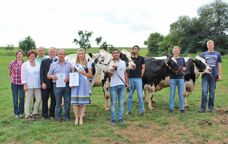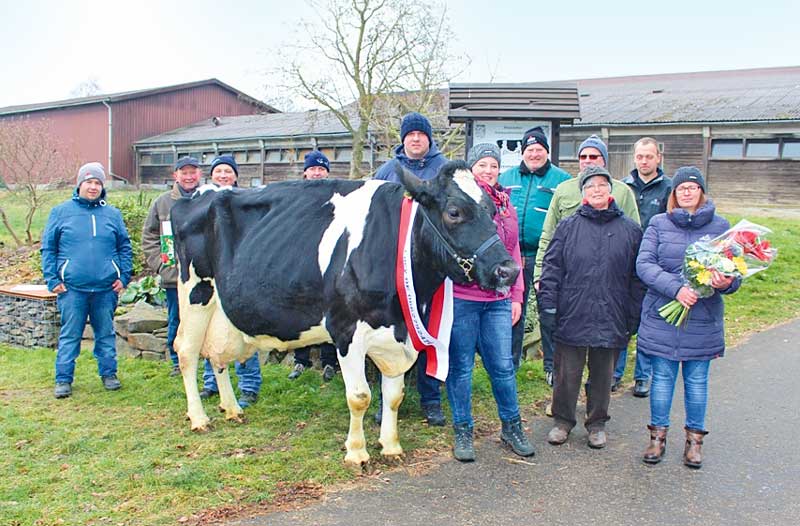 Gleich vier 100 000-Liter-Kühe stellte der Zuchtbetrieb von Marion und Heinz-Wilhelm Trümner aus Schiffelbach seinen Gästen bei einer Feierstunde vor. Nach der bekannten Shottle-Tochter Nikola, die erst kürzlich auf der Kreistierschau in Amöneburg für die Lebensleistung von über 100 000 Liter Milch geehrt wurde und ihrer Schwester Nadja, die schon länger die 100 000 Liter-Grenze überschritten hat, erreichte nun auch die erste Tochter von Nikola, die Artic-Tochter Nixe kurz nach ihrer Mutter die hohe Lebensleistung. Weiterhin wurde die Garrison-Tochter Nagold als vierte der vorgestellten Kühe für die hohe Lebensleistung von über 100 000 Liter Milch geehrt.