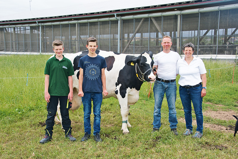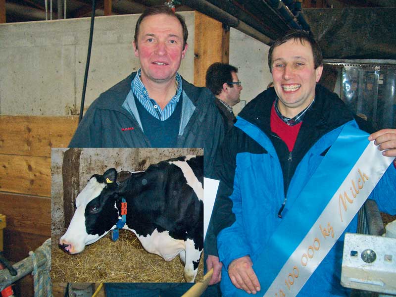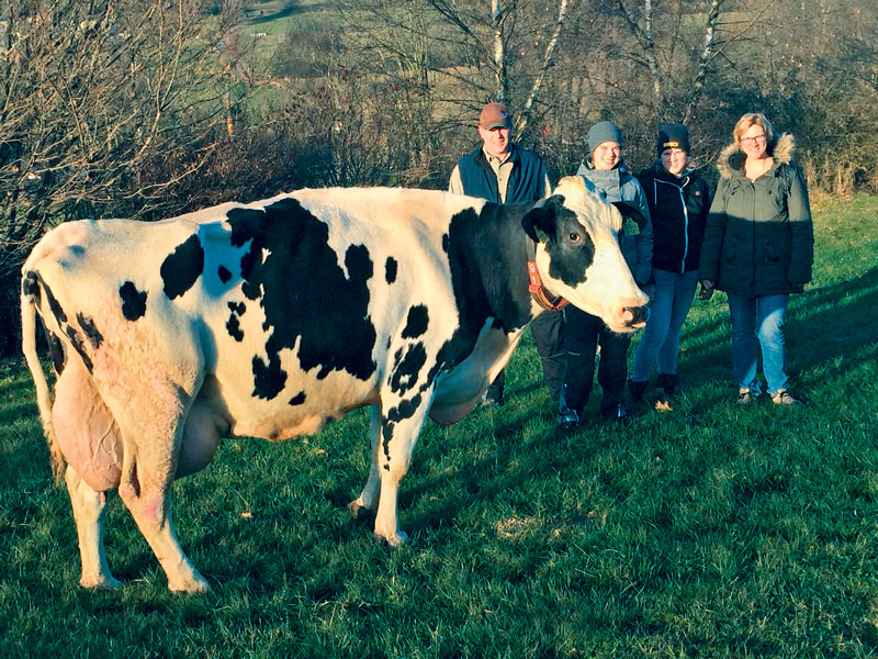 Im Betrieb von Heidi und Marc Golomb in Schwarzenborn erreichte kürzlich die Gibor-Tochter Tina VG85 mit einer mittleren Leistung von 11 314 - 3,34 - 3,24 die 100 000-Liter-Grenze nach acht Laktationen. Die im Betrieb Conrad Wernerberg, Neukirchen-Christerode, geborene Kuh verbrachte die ersten zwei Laktationen im Anbindestall mit gut durchschnittlichen Leistungen. „Der Umzug in unseren Boxenlaufstall, in dem seit 2003 per AMS gemolken wird, war alles andere als einfach“, erinnert sich Marc Golomb. Trotz der nicht einfachen Eingewöhnung in die Herde zeigte Tina schnell, welche Leistungsbereitschaft in ihr steckt. Ab dem dritten Kalb produzierte sie konstant auf sehr hohem Niveau und zeigte sich als problemlose und fruchtbare Kuh mit auffallend kurzen Tragezeiten. Die Fitness und Vitalität, welche die Kuh zeigt, wollen Heidi und Marc Golomb nicht nur über die vorhandenen Töchter, sondern auch über den kürzlich geborenen Scipio-Sohn, der für die Nutzung im eigenen Bestand aufgezogen werden soll, in ihre Herde stabilisieren. Jost Grünhaupt, LLH Kassel, Foto: privat