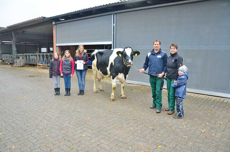 Mit ihrer Stanley II-Tochter Elana GP84 stellte die Familie von Dirk und Kerstin Fehr in Wollrode ihre dritte Kuh mit einer Lebensleistung von 100 000 Liter Milch vor. Auch zwölfjährig zeigt Elana noch einen hervorragenden Körperbau und das Euter sitzt noch am Sprunggelenk. Anhand der Ergebnisse aus der linearen Exterieurbeschreibung lässt sich die vorzügliche Weiterentwicklung der Kuh vom ersten Kalb an sehr gut ablesen. Das Leistungsbild dieser Kuh, die bei neun Laktationen einen Durchschnitt von 10 649 - 4,11 - 3,45 nachweisen kann, ist durch Ausgeglichenheit und solide Fruchtbarkeit gekennzeichnet: Die letzten fünf Kälber wurden jeweils im Oktober geboren. Kerstin Fehr hofft, dass die jüngsten Töchter von Borussia, beziehungsweise Lazio, in ihre Fußstapfen treten werden und ähnlich lange zur Füllung des Milchtanks auf ihrem Betrieb beitragen. Text/Foto: Jost Grünhaupt, LLH Kassel