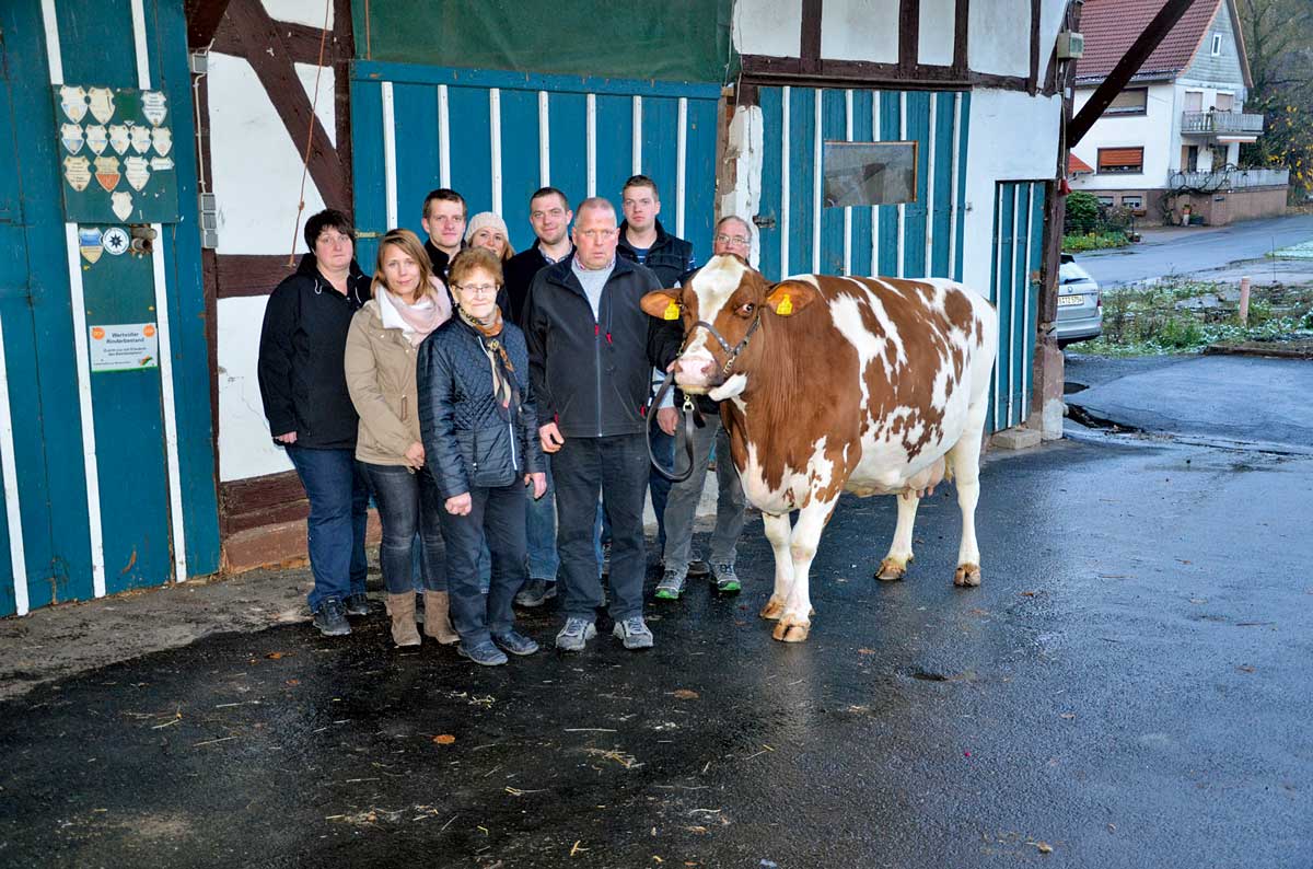 Im Betrieb der Familie Friedhelm Hecker in Willershausen wurde kürzlich mit der Jerom-Tochter Montana VG88 die zweite Kuh mit über 100 000-Liter-Lebensleistung vorgestellt. Nach elf Abkalbungen und einer Durchschnittsleistung von 9 702 - 4,18 - 3,18 zeigt sie sich noch sehr frisch und überzeugt in allen wesentlichen Merkmalen des Körperbaus und Skeletts. Die zweite 100 000-Liter-Kuh dieses Betriebes ist gleichzeitig ein Zeichen für die jahrzehntelange aktive züchterische Arbeit, welche die gesamte Familie Hecker über Generationen geleistet hat. Das Beschicken von Tierschauen und Zuchtviehauktionen sind für Friedhelm Hecker und Vater Konrad wichtiger Bestandteil ihrer Arbeit. Auch Montana hat mehrere gekörte Söhne hervorgebracht. Nach einem Brandschaden vor Jahren entschied sich die Familie Hecker auch wegen der Herdengröße, die kaum über 30 Kühe lag, nicht in einen neuen Stall zu in­vestieren, sondern mittelfristig aus der Milchviehhaltung auszusteigen. „Dass wir es geschafft haben, mit Montana noch einmal eine Kuh mit über 100 000-kg-Lebensleistung vorstellen zu können, macht uns stolz und etwas wehmütig zugleich“, stellt Friedhelm Hecker fest und beschreibt die Passion der gesamten Familie Hecker für die Rinderzucht. Text/Foto: Jost Grünhaupt, LLH Kassel