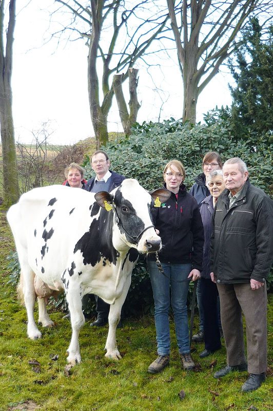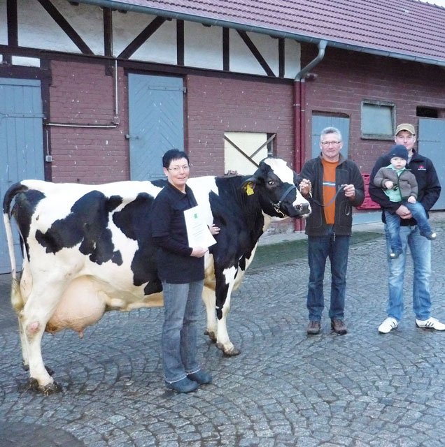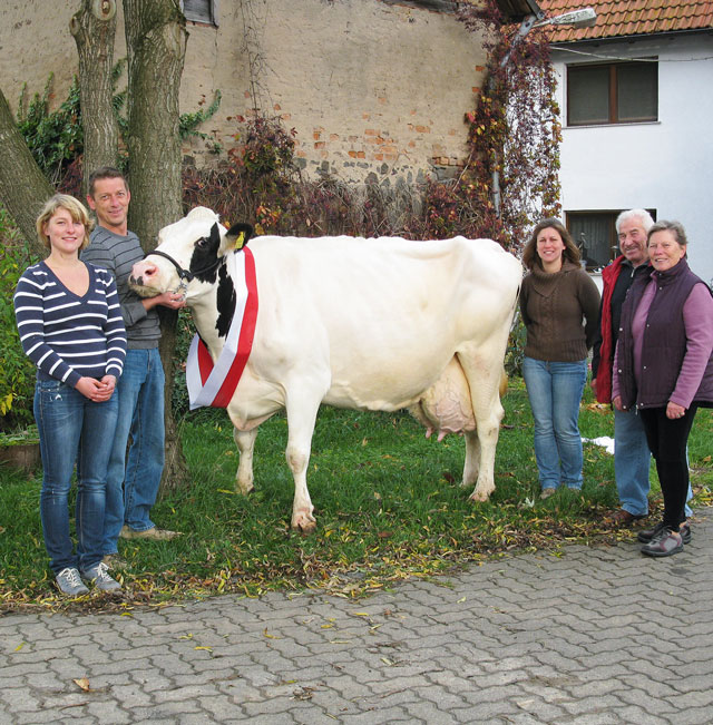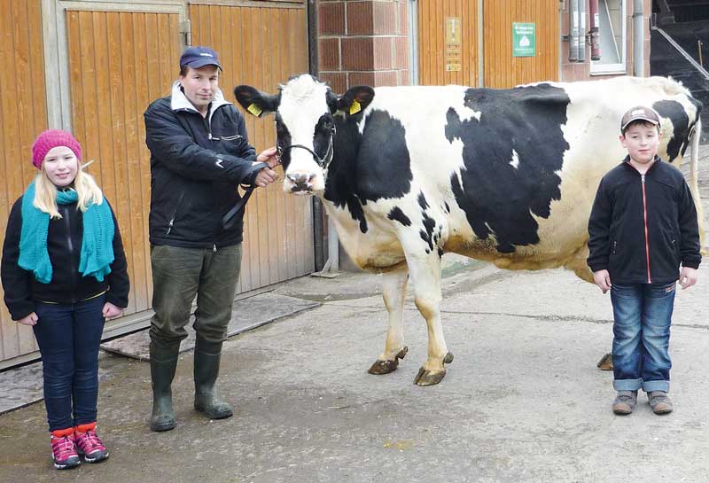 Die schwarzbunte Holsteinkuh „Helena“ hat jetzt als erste Kuh des Be­triebs Schick GbR in Amöneburg-Erfurtshausen die 100 000-Liter-Lebensleistung überschritten. Das neue Mitglied im Club der hessischen Dauerleistungskühe wurde von Andreas Schick als tragende Färse in Niedersachsen zugekauft und hat 2003 zum ersten Mal gekalbt. In acht abgeschlossenen Laktationen hat sie eine durchschnittliche Leistung von 10351 kg Milch mit 4,19% Fett und 3,40% Eiweiß erbracht und erreichte nach dem vierten Kalb mit 12547 kg Milch ihre höchste Leistung. Die Norma-Tochter hat ihr neuntes Kalb am 3. Juli 2013 zur Welt gebracht, ist aktuell wieder besamt und zwei ihrer weiblichen Nachkommen wurden zur Bestandsergänzung in die Herde aufgenommen. Besonders positiv aufgefallen ist die Kuh, die 2005 in den neuen Boxenlaufstall umgezogen ist, durch ihre gute Melkbarkeit sowie ein angenehmes Melkverhalten. Andreas Schick und seine Mitarbeiter freuten sich über die sehr vitale und korrekte dreizehnjährige Helena. Text/Foto: Ute Ermentraudt, LLH Korbach