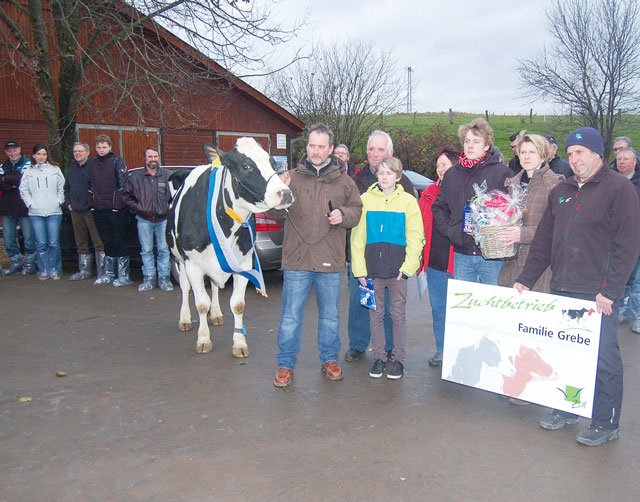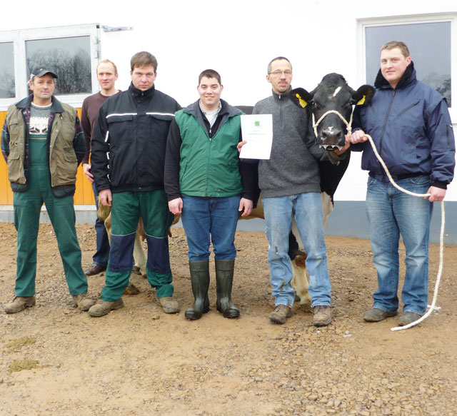 Im Betrieb Wegfahrt in Niederaula konnte mit Laila die erste Kuh in den Club der 100 000-Liter-Kühe aufgenommen werden. Die Kuh Laila ist eine Tochter des Bullen Dolch, der für seine funktionellen Kühe mit sehr guten Eutern bekannt ist. Auch mit zehn Jahren zeigt sie sich mit einem korrekten, drüsigen Euter und guten Fundamenten. Laila wurde als Kalb im Betrieb Stefan Reinhard in Elters geboren und an den Betrieb Stefan Kapp in Haselstein verkauft. Im Betrieb Kapp wurde Laila aufgezogen und kam dann als abgekalbte Färse zur Familie Wegfahrt in Niederaula. Stefan Kapp war bei der Ehrung als ehemaliger Lehrling und Aufzüchter von Laila natürlich anwesend, denn er hat genauso wie die Mitarbeiter im Betrieb Wegfahrt einen erheblichen Anteil an der Leistung dieser Kuh. Wenn man bedenkt, dass die Kuh ihre Leistung bis zum Sommer 2013 im Anbindestall mit Gitterrosten erbracht hat, ist das schon eine Würdigung wert. Im Sommer erfolgte der Umzug in den neuen Stall. Laila hat sechs Kälber zur Welt gebracht, davon befindet sich eine Goldday-Tochter mit dem dritten Kalb im Bestand und ein Jungrind befindet sich in der Aufzucht. Da die Kuh wieder trächtig ist, bleibt die Hoffnung auf einen weiteren weiblichen Nachkommen. Die Leistungsbereitschaft der Kuh ist enorm, denn sie startete mit 9 600 Liter in der ersten Laktation und steigerte sich bis zur sechsten Laktation auf 15 500 Liter mit 3,24 Prozent Fett und 3,34 Prozent Eiweiß. Die hessischen Rinderzüchter gratulieren der Familie Wegfahrt mit ihren Mitarbeitern zu diesem züchterischen Erfolg. Text/Foto: Christian Dörr, LLH Alsfeld