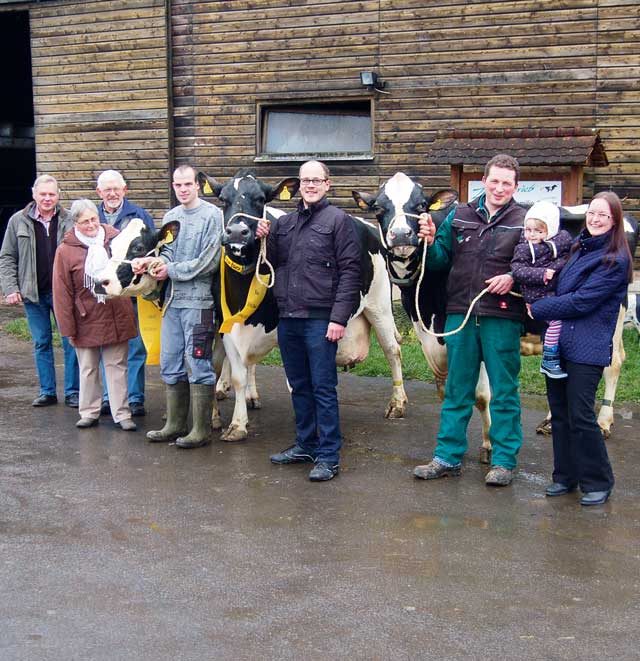 Zu den wenigen Adressen, die inzwischen ein Mutter-Tochter-Paar mit jeweils über 100 000 Liter Lebensleistung nachweisen können, gehört inzwischen der Zuchtbetrieb von Martin Klarmann in Altenstadt. Nachdem vor zwei Jahren die Blackchamp-Tochter Gallone als Dauerleistungskuh vorgestellt werden konnte, hat sich jetzt ihre Sarlet-Tochter Galine VG86 mit einer Lebensleistung von nun annähernd 110 000 kg Milch mit hohen Inhaltsstoffen in der Liste der Rekordkühe etabliert. Sicherlich hat die leistungsfähige, väterliche Großmutter Schneeflocke aus dem Zuchtbetrieb Kaletsch, Rodenhausen, die bei acht Abkalbungen ein Mittel von 13 361 - 3,85 - 3,34 erreichte, mit dazu beigetragen, dass Galine auf diesen Spitzenwert kam. Dass in dieser Kuhfamilie eine hervorragende Vererbungskraft steckt, wurde auch durch Galines bei Hessens Zukunft erfolgreich ausgestellte Canvas-Tochter Gerbel deutlich. Die in den letzten Jahren aus der Herde Klarmann auf der Tierschau in Bad Vilbel vorgestellten Kühe zeigten, dass mit Engagement und Erfolg auf diesem Betrieb züchterisch gearbeitet wird. Damit sind hervorragende Voraussetzungen gegeben, dass auch demnächst ein Spitzentier der Familie Klarmann zu einer Ehrung ansteht.