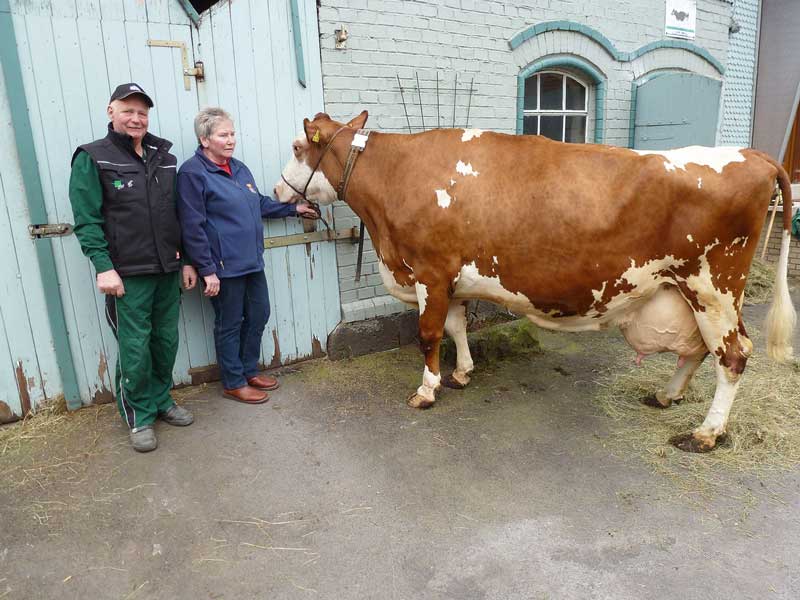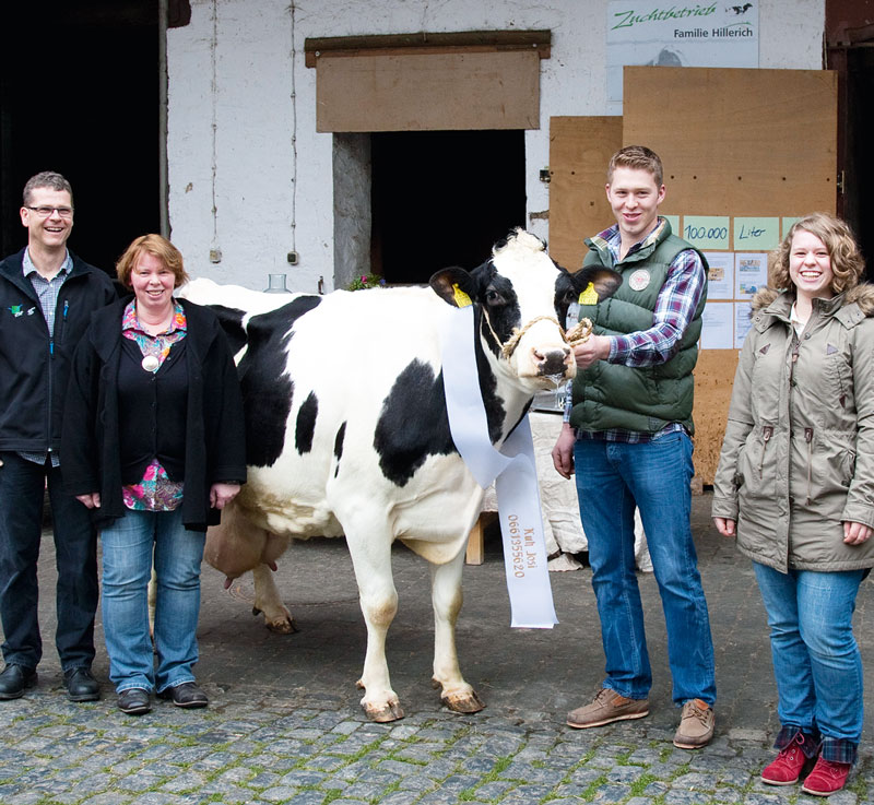 Im Betrieb von Bernhard und Pia Hillerich in Ueberau überschritt vor zwei Jahren die erste Fleckviehkuh die 100 000-Liter-Grenze. Jetzt kam die Holsteinkuh Josi VG 85 von Prelat dazu, welche die Veranlagung zu hohen Lebensleistungen offensichtlich von beiden Elternteilen mitbekommen hat: sowohl ihre Mutter Jasmin als auch ihre väterliche Großmutter Flamin brachten es auf acht sowie sieben Abkalbungen und herausragenden Lebensleistungen. Bei der Vorstellung der Kuh stellte sich heraus, dass die Mehrzahl der Nachzucht heute nicht mehr auf dem Betrieb Hillerich zu finden ist, beide Söhne aus der Anpaarung mit Lee und Rubens wurden an Betriebe in der näheren Gegend verkauft und ein Zuchtbetrieb, ebenfalls in unmittelbarer Nähe von Ueberau, erwarb mehrere direkte Töchter von Josi. Trotzdem sind noch über verschiedene Seitenzweige diverse Nachkommen auf dem Betrieb vorhanden. Die Leistungsentwicklung von Josi ist typisch für viele Kühe mit hohen Lebensleistungen, ohne absolute Höchstleistungen hat sie durch ihre Regelmäßigkeit und kurze Abstände bei den Kalbungen in der elften Laktation die 100 000er Grenze überschritten. Die Frische und Fitness der Kuh ist auch darauf zurückzuführen, dass auf dem Betrieb Hillerich die Betreuung der Kühe einen sehr hohen Stellenwert hat. Dies ist auch bei Projekten, bei denen Pia Hillerich aktiv beteiligt war, bereits zum Ausdruck gebracht worden und über den Besuch von diversen Gruppen sind nicht nur Josi, sondern auch ihre Herdengefähr­tinnen schon mit vielen Leuten in Kontakt gekommen. Gleichzeitig zählt die Familie Hillerich zu den wenigen Betrieben, die 100 000-Liter-Kühe von beiden auf dem Betrieb gezüchteten Rassen vorstellen konnten.