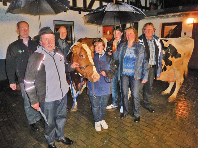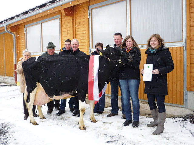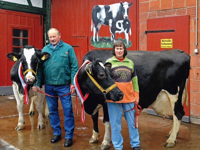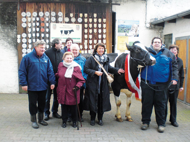 Im Betrieb von Peter Heimroth Oberstoppel sind mit Ludwina und Trude gleich zwei hessische jeweils sechsjährige Spitzenkühe, die wegen ihrer hohen Lebensleistungen von je über 100 000-Litern-Milch im Rampenlicht standen.  Während einer Ehrung der schwarzbunten Tiere mit entsprechenden Schärpen und Urkundenüberreichungen an den Landwirt und dessen Lebensgefährtin Brigitte Stieler stellte Jost Grünhaupt, Zuchtleiter im Landesbetrieb Landwirtschaft Hessen, die hohe Milchleistung je Futtertag heraus. Beide haben bislang je sechs Kälber zur Welt gebracht. Bereits mit dem ersten Kalb startete die vom Vererber Emilio abstammende Ludwina mit 11 000 kg. Ihre Höchstleistung lag in der fünften Laktation mit 18 897 kg bei 5,01 Prozent Fett und 3,07 Prozent Eiweiß. Die durchschnittliche Jahresmilchmenge wurde mit 15 000 kg (4,83 Fett/ 3,23 Eiweiß) ermittelt. Trude stammt vom Bullen Jovial ab. Im Durchschnitt der Jahre lieferte sie 13 500 kg Milch bei 3,92 Prozent Fett und 3,19 Prozent Eiweiß. In ihrem besten Jahr kam sie auf 16 191 kg (4,07 Fett/3,14 Eiweiß). „Gegenüber anderen hessischen Kühen gaben die beiden fünf Liter mehr Milch pro Tag“, so Grünhaupt. Er stellte die langjährig hohe Leistungsfähigkeit der Kühe und deren hervorragende Genetik heraus. „Trotz ihrer hohen Milchmengen, sehen sie stabil gut aus, haben einen klaren Blick.“ Aber nicht nur von da rühre ein solcher Erfolg. Die gute Betreuung der Tiere und das entsprechende Futter von hoher Qualität seien mitverantwortlich in dem 410 Meter hoch gelegenen Grünlandbetrieb. Die Betreuung der Tiere mache ein Drittel vom Erfolg aus, meinte Ottmar Keuchler, der als Vertreter der Milchwerke Hochwald Heimroth und Stieler besondere Anerkennung für ihre Arbeit zollte. Peter Heimroth erklärte, seine 25 Kühe große Herde bekomme in den Sommermonaten abends Weidegang. Dank sagte Heimroth ebenso seinem Hoftierarzt Dr. Christoph Caselitz aus Arzell und dem Hessischen Verband für Leistungs- und Qualitätsprüfungen in der Tierzucht (HVL), vertreten durch Wigbert Kalb, für die gute Herdenbetreuung. Für die Rinderzüchter im Kreis Hersfeld-Rotenburg gratulierte HVL-Vorstandsmitglied Hartmut Nuhn. Text/Foto: Karl-Heinz Burkhardt