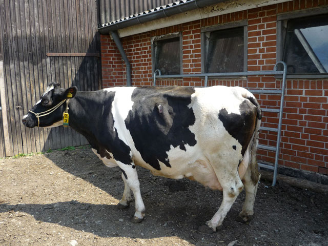 Mit inzwischen 115 000 kg Milch Lebensleistung präsentierte kürzlich die Familie Richter in Erlensee-Rückingen mit der PM Magic-Tochter Ombra VG 89 eine Dauerleistungskuh, die mit einer durchschnittlichen Tagesleistung von 32 kg Milch zu den Spitzentieren dieser Kategorie zählt. Diese Leistungsfähigkeit ist auf beiden Elternseiten abgesichert, denn nicht nur über den heute noch positiven Zuchtwert-gelisteten Vater, sondern auch von Mutterseite her sind hohe Milchleistungen über viele Generationen abgesichert. Bereits bei der Großmutter, einer Tochter des bekannten Vererbers F16, ist eine erstklassige Produktion über neun Laktationen auf hohem Niveau nachgewiesen. Dieses abgesicherte hohe Leistungsvermögen, kombiniert mit einer hervorragenden Versorgung der Kühe, wie auf dem Betrieb Richter gegeben, ist die notwendige Voraussetzung, um herausragende Dauerleistungskühe wie die PM Magic-Tochter Ombra vorstellen zu können. Text/Foto: Jost Grünhaupt, LLH Kassel