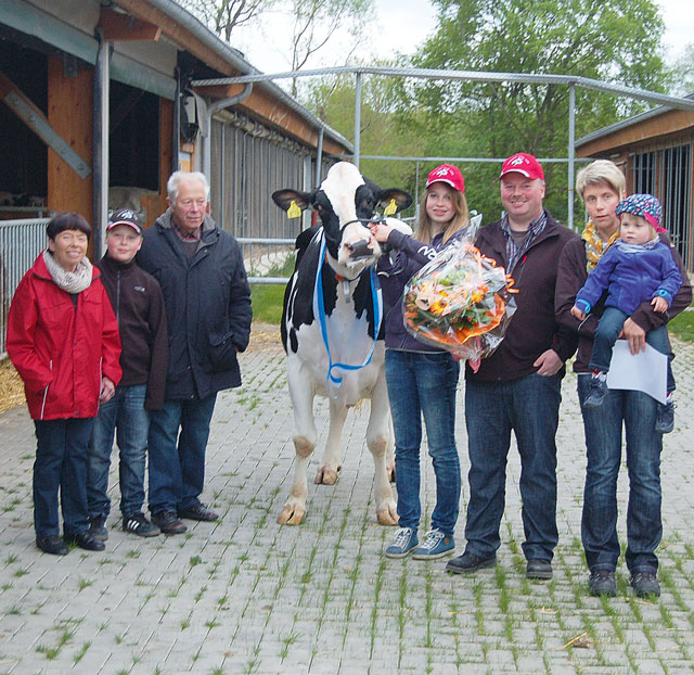 In Hessen schaffen die 100 000-Liter-Lebensleistung nur circa 50 Kühe im Jahr. Und dass gleich vier Kühe aus einem Stall diese magische Grenze in einem Jahr überschreiten. Auf dem Betrieb von Paul und Jochen Wagner in Ober-Mörlen hatten sich viele Gäste eingefunden, um der Familie zu diesem Ereignis zu gratulieren. Bereits vor vier Jahren hatte die heute fast 17-jährige Bookie-Tochter Andrea die 100 000-Liter-Grenze erreicht. Inzwischen hat sie über 137 000 Liter Milch gegeben. Andrea, die mittlerweile 13 Mal gekalbt hat, ist mit 86 Punkten bewertet. Jeweils acht Kälber brachten die beiden zwölfjährigen Kühe Arabella und Mandy zur Welt. Die Formation-Tochter Arabella, die aus einer mütterlichen Halbschwester von Andrea stammt, ist ebenfalls mit 86 Punkten bewertet und hat eine Durchschnittsleistung von fast 12 000 kg Milch. Die Conductor- Tochter Mandy hat eine Durchschnittsleistung von über 13 300 kg Milch mit einer Höchstleistung von 15 686 kg Milch. Sie wurde nach dem dritten Kalb mit 87 Punkten eingestuft und hat diese Exterieurqualität an ihre Tochter Maja weitergegeben, die 88 Punkte erreicht hat. Die vierte Dauerleistungskuh ist die 14-jährige Charles-Tochter Carolin, die bis jetzt neunmal gekalbt hat und auf eine Durchschnittsleistung von 10 000 kg Milch kommt, bei einer Höchstleitung von 12 800 kg Milch. Carolin wurde nach dem vierten Kalb mit 88 Punkten bewertet. Aufgrund ihrer herausragenden Exterieurqualität wurden vier ihrer Söhne als Zuchtbullen in den Deckeinsatz verkauft. Neben Paul Wagner kümmert sich vor allem Sohn Jochen mit viel Herzblut um die Herde mit derzeit 75 Kühen plus 90 Tiere weibliche Nachzucht. Das Bild zeigt die vier vitalen Kühe Mandy, Arabel­la, Carolin, Andrea (v.l.) mit Paul, Brigitte Wagner, Jochen und Bianca Wagner mit den Kindern Ben und Jule. Text: Bernd Koch, Foto: Annette Hausmanns
