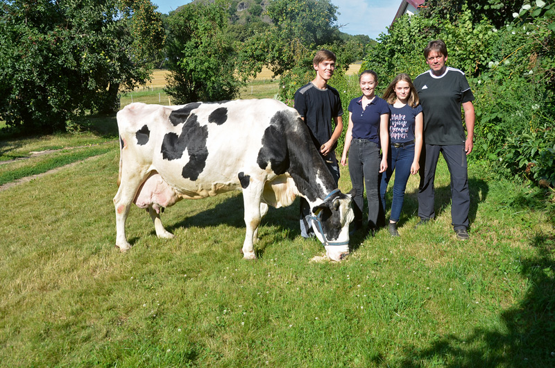 Seit langer Zeit gehört der Rotbuntzuchtbetrieb der Familie Woltert im Lauterbacher Ortsteil Sickendorf zu den beständigsten und erfolgreichsten Beschickern des örtlichen Prämienmarktes. Von den zwei aktuell 100 000-Liter-Kühen hat die Classic-Tochter Elaine mehrfach erfolgreich in Lauterbach teilgenommen und sich als sehr solide, dauerhafte Kuh mit einem Mittel von 8 487 – 4,18 – 3,35 herausgestellt. Eine etwas andere Leistungsentwicklung hat die Stallgefährtin Aaltje von Chabrol, die mit einem Mittel von 7 Laktationen mit 12 441 – 4,20 – 3,49 gelistet ist. Beide stammen aus sehr soliden Mutterlinien und haben auch einiges an weiblicher Nachzucht hinterlassen, sehr zur Freude der gesamten Familie Woltert. Mit Recht vertraut die gesamte Familie auf ihre gut durchgezüchtete Rotbuntherde und nutzt von Beginn an das Selektionsinstrument KuhVision, um ein Höchstmaß an Sicherheit bei der Selektion der weiblichen Nachzucht auch in Bezug auf die Sekundärmerkmale zu haben. Dass diese sehr bedeutend sind, beweisen letztendlich die vorgestellten 100 000-Liter-Kühe. Damit sind insgesamt sehr gute Voraussetzungen gegeben, dass auch in Zukunft weitere erstklassige Tiere bei den verschiedensten Anlässen aus dem Zuchtbetrieb Woltert, Sickendorf, präsentiert werden können.