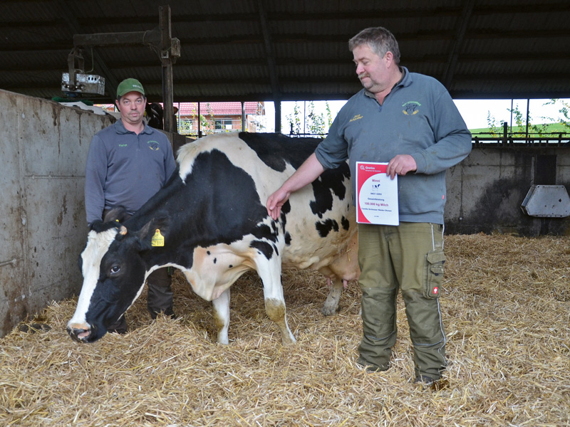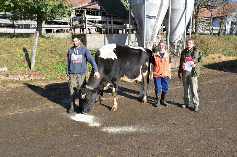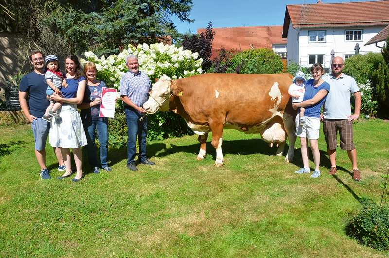 Die Weiterentwicklung in der Milchviehhaltung hat es mit sich gebracht, dass auf den Höfen separate Bereiche für Frischmelker oder trockenstehende Kühe zum normalen Ablauf gehören und sicherlich mit dazu beigetragen haben, dass die Zahl der Lebensleistungskühe in den letzten Jahren kontinuierlich angestiegen ist. Dass dieses jedoch nicht zwangsläufig etwas mit der Herdengröße zu tun haben muss, hat Jürgen Nix aus Gersfeld mit seiner Familie kürzlich gezeigt. Dort wird aktiv und engagiert im Nebenerwerb Milchviehhaltung und Fleckviehzucht betrieben und die Sigmo-Tochter Biene hat dort zu Beginn der 11. Laktation mit 8 705 – 4,28 – 3,12 die 100 000-Liter-Grenze überschritten. Ganz sicher hat das enorme Leistungspotenzial in Verbindung mit tadelloser Fruchtbarkeit und den sehr guten Gebrauchseigenschaften entscheidend dazu beigetragen, dass die Kuh jetzt über die 100 000-Liter-Grenze gekommen ist. Für unseren Betrieb, da ist sich die gesamte Familie einig, ist es schon etwas Besonderes, eine solche Kuh präsentieren zu können, gleichzeitig aber auch eine enorme Motivation, auch weiterhin aktiv und engagiert Fleckviehzucht zu betreiben.Text/Foto: Grünhaupt, LLH Kassel