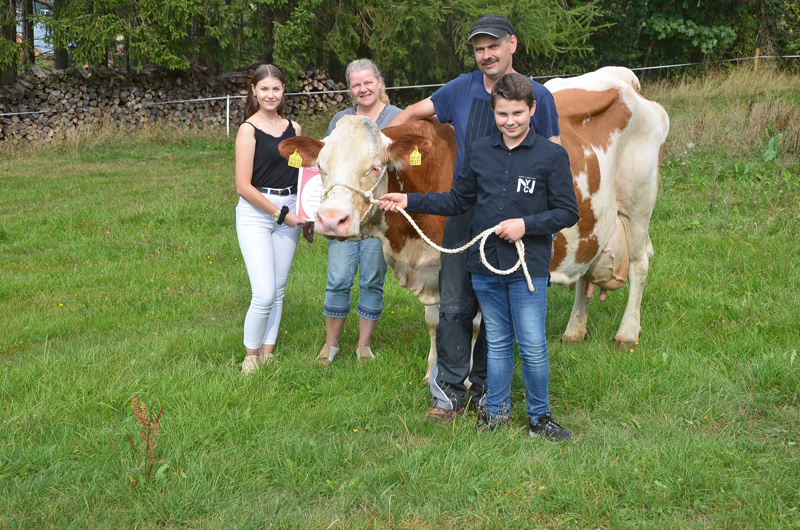 Zu einer der ältesten und auch erfolgreichsten Kuhfamilien, die es in der hessischen Fleckviehzucht gibt, zählt die Smaragd-Tochter Garde, die im Zuchtbetrieb der Familie Schleich in Lichenroth zu Hause ist. Bei der Präsentation der Kuh, die nach neun Laktationen mit einem Durchschnitt von 10 469 – 4,35 – 3,26 die 100 000 Liter-Grenze überschritten hat, wies Erhard Schleich darauf hin, dass diese Linie über Jahrzehnte im Betrieb prägend war. Ein Blick in die Väterfolge zeigt, dass in der Ahnengalerie mit Besamungsbullen wie Rumba, Humlang, Romen, Tartars, Half und Hassan durchweg überlegene Bullen mit sicherer Leistungs- und Exterieurvererbung standen – ein maßgeblicher Grund für den Erfolg im Betrieb. Auch das Leistungsbild in den zurückliegenden Jahren im Betrieb war durchweg herausragend, und das ist auch bei den Vorfahren von Garde festzustellen. Mehrfach wurden Besamungsbullen aus dieser Kuhfamilie eingesetzt und zu den erfolgreichsten zählt sicherlich der vor 20 Jahren genutzte Bulle Motor, der deutschlandweit als Bullenvater zum Einsatz kam. Anhand der vorhandenen Fotos konnte man nicht nur den Zuchtfortschritt in der Herde sehen, sondern auch die bereits in den 60er Jahren vorhandenen Spitzenkühe zeigen die Überlegenheit, die in dieser Kuhfamilie steckt. Es ist schade, so fasst Erhard Schleich seine Erfahrung zusammen, dass es von Garde keine weibliche Nachzucht gibt, nur Bullenkälber oder Zwillinge waren dabei. Aber es ist zweifellos ein schöner Abschluss der züchterischen Arbeit für die Familie Schleich, denn die Milchlieferung an die Molkerei wurde inzwischen eingestellt.