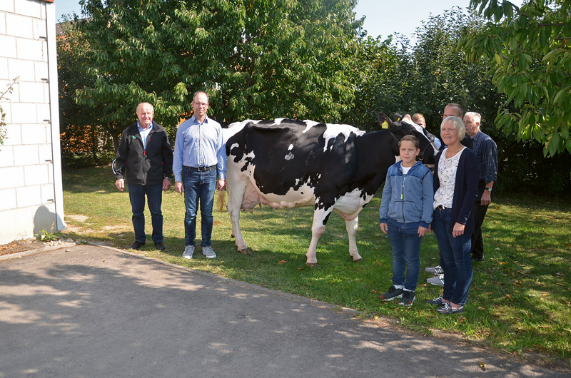 Im Stil einer typischen Dauerleistungskuh hat die Dominator-Tochter HBH Havanna GP 84 auf dem Hof der Familie Hamel in Buchenberg die 100 000-Liter-Grenze überschritten. Typisch für die väterliche Abstammung ist, dass die Milchmenge mit besonderer Konstanz ohne absolute Spitze erbracht wurde und der Durchschnitt mit 9 560 – 4,23 – 3,23 gelistet ist. Es gibt viel weibliche Nachzucht aus der Kuh und ihre älteste Tochter von dem Vererber Curtis hat bereits 80 000 Liter Milch produziert. Die Frische der Kuh, verbunden mit einem hervorragenden Euter lassen erwarten, dass Havanna noch einige Zeit im Stall der Familie Hamel Milch produziert und mit ihrer weiblichen Nachzucht dazu beiträgt, die Herde weiter zu entwickeln. „Mit der Beteiligung an dem Programm Kuh-Vision verfügt der Betrieb über umfangreiche Daten über den gesamten Gesundheitsbereich und die positiven Entwicklungen sind nicht zu übersehen“, fasst Junior Johannes Hamel seine Eindrücke zusammen.  Text/Foto: Grünhaupt, LLH Kassel