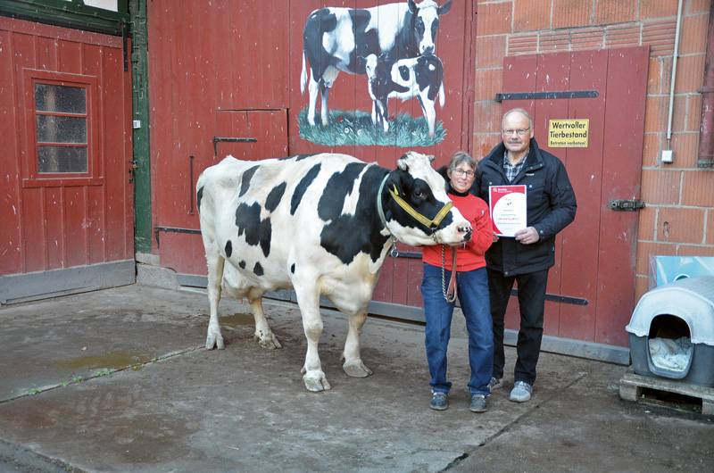 Seit geraumer Zeit zählt die Milchviehherde von Peter Heimroth und Brigitte Stieler in Oberstoppel zu denen im Lande, die für sehr hohe Leistungsfähigkeit bekannt sind: Die durchschnittliche Herdenleistung lag in den letzten Jahren mehrfach über 1 000 kg Fett und Eiweißmenge. Jetzt hat mit der Laudan-Tochter Elia eine weitere Kuh aus diesem Zuchtbetrieb zehn-jährig die 100 000 Liter-Grenze überschritten. Ihre Durchschnittsleistung bei vier Laktationen liegt bei 14 119 – 3,58 – 3,18 und ihre mütterlichen Vorfahren haben auf ähnlich hohem Niveau produziert. Mit ihrem korrekten Körperbau, der exakten Strichverteilung und dem nach wie vor tadellosen Eutersitz erfüllt die Kuh hervorragende Maßstäbe. „Bei diesem Leistungsniveau muss die Fütterung schon stimmen“, ergänzt Peter Heimroth mit einem Lächeln, „aber dass wir was ganz Ausgefallenes machen, kann man nicht sagen“, so der erfahrene Milchviehhalter. Sicher trägt auch die Halbtagsweide mit zur Fitness der Kühe bei. Eines ist den beiden engagierten Milchviehhaltern aber besonders wichtig: Hohe Lebensleistungen sind nicht nur auf das entsprechende Stallsystem zurückzuführen, sondern die Betreuung der Herde in allen maßgeblichen Bereichen muss stimmen. Das ist aus ihrer Sicht viel wichtiger. Text/Foto: Grünhaupt, LLH Kassel