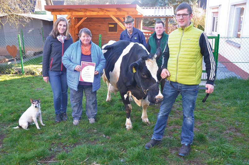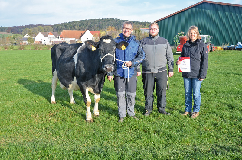 Nach Überschreiten der 100 000-Liter-Grenze wurde die noch mit viel Frische und Bewegungsfreudigkeit ausgestattete Masolino-Tochter Karla auf dem Hof der Familie Schreiner in Altenhain Grenze präsentiert. „In der Herde läuft die alte Dame noch nach wie vor gut mit und an Anbinden oder Festhalten ist bei ihr nicht zu denken“, fassen Martin und Stefanie Schreiner ihre Erfahrungen zusammen. Da war die Zwillingsschwester, die auch äußerlich sichtbare Unterschiede zeigte, schon anders. Das Leistungsniveau bei elf Abkalbungen mit 8 619 – 4,11 – 3,48 ist charakteristisch für eine Dauerleistungskuh und auch bei ihrer Mutter Klara, einer Motor-Tochter, waren bereits acht Abkalbungen mit überlegenen Leistungsdaten festzustellen. Zum Glück ist einiges an weiblicher Nachzucht von der 100 000-Liter-Kuh vorhanden: Ob es eine davon schafft, in die Fußstapfen ihrer Mutter zu treten, wird die Zeit zeigen, da ist sich das engagierte Züchterehepaar mit einem Lächeln im Gesicht einig.