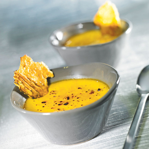 Den Backofen auf 160 °C vorheizen. Den Kürbis schälen und in kleine Würfel schneiden. Mit etwas Olivenöl in einer Pfanne bei milder Hitze bei ständigem Rühren garen bis ein Mus entstanden ist. Mit dem Oregano würzen. Die Milch in einen Mixer geben, Kürbismus zugeben und fein pürieren. Durch ein Haarsieb streichen. Eigelb in einer Schüssel verquirlen und mit Salz und Pfeffer würzen. Kürbis, Sahne und die Hälfte des Parmesans vorsichtig untermischen. Die Masse in die Förmchen geben und diese in eine Auflaufform stellen. Die Form bis zu zwei Drittel der Förmchen mit lauwarmem Wasser aufgießen und 30 Minuten im Backofen garen. In dieser Zeit eine beschichtete Pfanne ohne Fett erhitzen. Mit Hilfe eines Löffels den Parmesan in vier kleinen Häufchen in die Pfanne geben. Die Parmesanchips leicht anbräunen, mit Hilfe eines Spatels wenden. Auf einem Teller beiseite stellen. Kürbiscrème aus dem Ofen nehmen, mit braunem Zucker bestreuen und mit dem Bunsenbrenner bräunen. Mit Parmesanchips verzieren und sofort servieren.