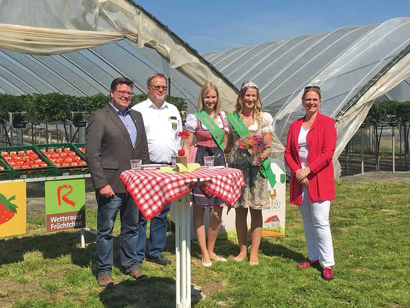 Am Wochenende wurde die neue Erdbeerkönigin Nadine I. (2. von rechts) des Gambacher Erdbeerkomitees in Butzbach/Nieder-Weisel offiziell vorgestellt und gekrönt. Die Überreichung der Insignien, Diadem und Schärpe, erfolgte durch ihre Vorgängerin Katharina I. (Mitte), wie das Komitee berichtet. Links auf dem Bild der Vizepräsident des Hessischen Bauernverbandes, Thomas Kunz und die amtierende Vizelandrätin des Wetteraukreises, Stephanie Becker-Bösch (rechts) sowie Uwe Schmittberger vom Gambacher Erdbeerkomitee (2. von links). Der Gambacher Erdbeer‑