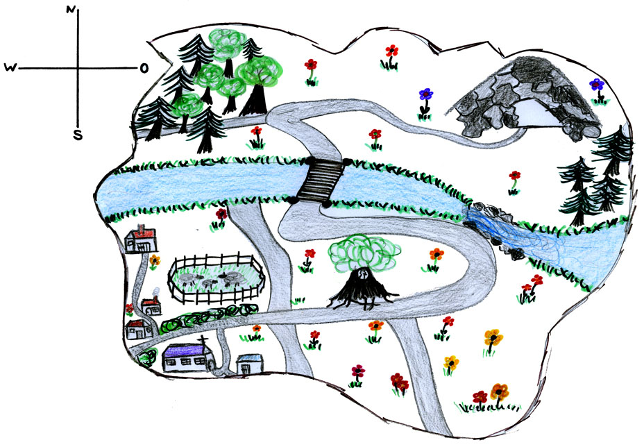 Beginne mit der Schatzsuche an dem mysteriösen Haus, in dem du diese Karte gefunden hast. Zuerst gehst du Richtung Süden, bis du an eine Hecke kommst, die aussieht wie eine riesige grüne Raupe, dann musst du Richtung Osten an der großen Eiche vorbei. Doch pass auf, dort ist eine Eule, die den Weg vor ihrem Baum überwacht. Wenn du es an ihr vorbei geschafft hast, musst du kurz Richtung Norden, bis zu dem Wasserfall und danach folgst du dem Weg bis zu einer Brücke, die über den Fluss führt. Über diese Brücke musst du gehen. Doch pass auf, sie ist schon etwas älter und manche Holzbretter sind vielleicht nicht mehr fest!