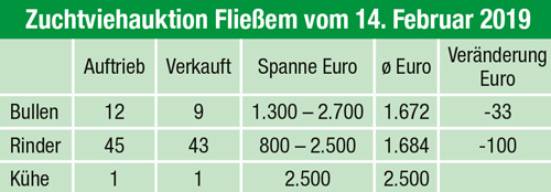 Die Blauzungenkrankheit bereitet dem Auktionsstandort der Rinder-Union West in Fließem nach wie vor große Schwierigkeiten. So konnten auf der Versteigerung am Donnerstag vergangener Woche wieder nur heimische Käufer bieten. Die zahlreichen Kunden aus Luxemburg, Belgien und Holland konnten nicht mitsteigern, da Tiere aus dem Sperrgebiet erst nach zweimaliger Impfung inklusive Wartezeit exportiert werden können. Dieser Umstand hielt einige Beschicker davon ab, Tiere zu melden. Aufgrund der guten Qualität bei den abgekalbten Holsteinfärsen waren am Ende der Versteigerung jedoch alle zufrieden.