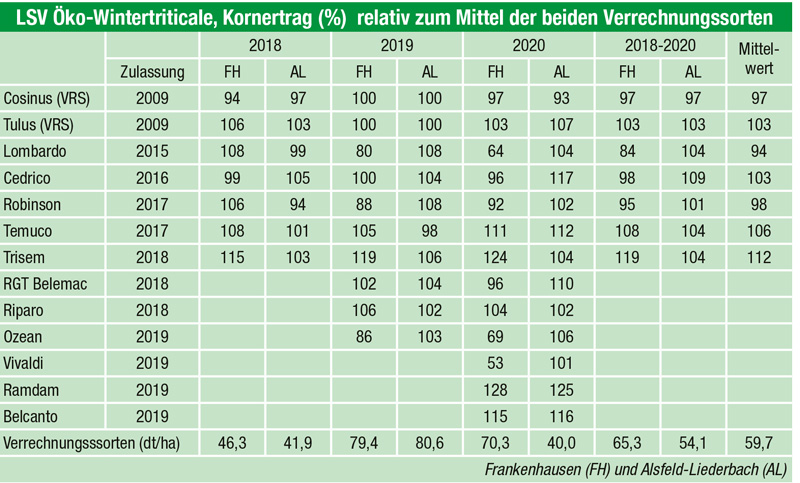 In den Jahren 2018 bis 2020 wurde der LSV Öko-Wintertriticale zusätzlich am Standort Frankenhausen (Landkreis Kassel) durchgeführt. Der über drei Jahre gemittelte Ertrag der beiden Sorten fiel mit auf dem sehr fruchtbaren Standort Frankenhausen mit 65 dt/ha deutlich besser aus als in Alsfeld-Liederbach (54 dt/ha).