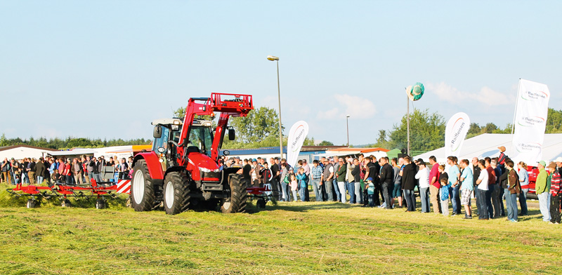 In Bad-Hersfeld-Friedewald fand kürzlich auf den Flächen des Betriebes von Jörg und Sabine Döring ein Grünlandabend veranstaltet von der Raiffeisen Waren GmbH mit Praxisvorführungen von Massey-Ferguson-Traktor-Baureihen in Verbindung mit Grünlandtechnik von Fella statt. Technische Neuheiten bezogen sich auf die Arbeiten Mähen, Zetten und Schwaden. Auch kamen Front-und Heckmähwerkskombinationen zum Einsatz sowie Doppelschwader. Bei der PraxisÂschau ging es ferner darum, die Geländetauglichkeit und Arbeitsqualität schlagkräftiger Technik zu verdeutlichen. Ortwin Landsiedel (Fella) und Martin Scharff (Massey Ferguson) erläuterten die Gespanne. Mario Soose, Spartenleiter Technik bei der Raiffeisen Waren GmbH und Kerstin Kempka, Regionsvertreterin für Massey-Ferguson, freuten sich über die große Resonanz von rund 500 Landwirten aus Nordhessen, welche die Vorführungen verfolgten und sich mit Vertretern der Unternehmen rege austauschten.