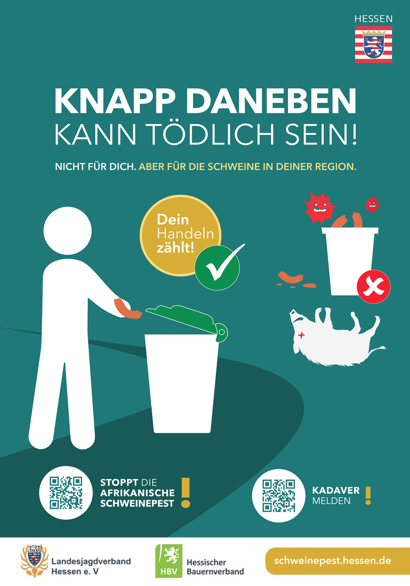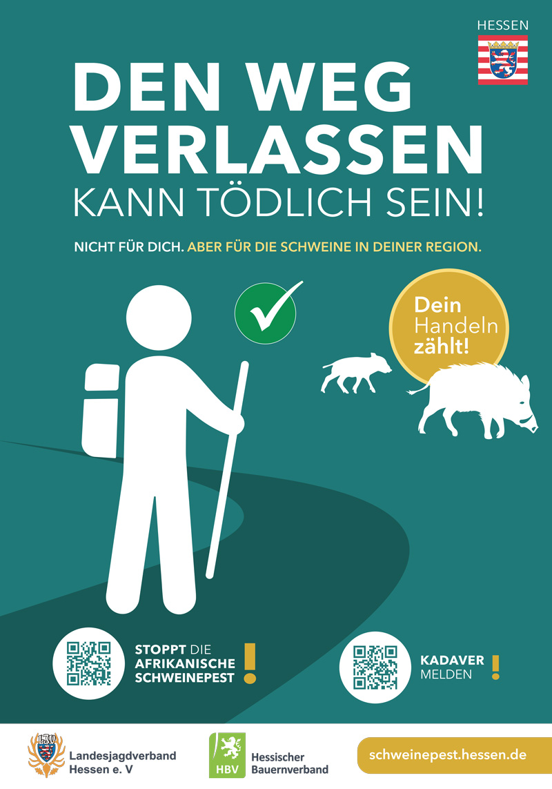 „Der Landesjagdverband unterstützt seit dem Ausbruch der ASP die Maßnahmen zur Eindämmung der gefährlichen Tierseuche. Mit der nun gestarteten Kampagne werden sowohl Bürgerinnen und Bürger als auch der Reise- und Transitverkehr für dieses wichtige Thema sensibilisiert. Nur wenn wir gemeinsam dazu beitragen, die ASP einzugrenzen und zu kontrollieren, erst dann kann sich in der Region wieder ein gesunder Schwarzwildbestand etablieren und die familiär geführten Schweinehaltungsbetriebe erhalten wieder eine Zukunftsperspektive“, so Prof. Dr. Jürgen Ellenberger, Präsident des Landesjagdverbandes Hessen e. V.