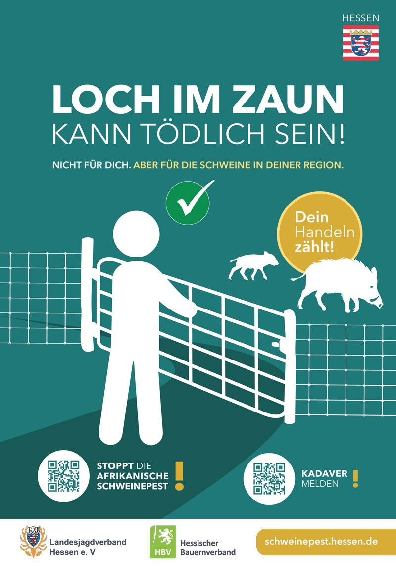 Das erste Großflächenplakat wird heute auf der Autobahnraststätte Büttelborn-West aufgestellt und klärt Durchreisende über die Tierseuche auf. „Es ist noch lange nicht vorbei. Die Bekämpfung der Afrikanischen Schweinepest gleicht einem Marathon, den wir nur mit Unterstützung der Bevölkerung gewinnen können. Erst, wenn wir in Hessen ein Jahr lang keinen positiven Fund mehr haben, können wir die Einschränkungen aufheben. Die Tierseuche belastet nicht nur unsere heimischen Schweinehaltungen, die Landwirtschaft und Jagd – sie verursacht bei den infizierten Tieren auch großes Leid, das wir unbedingt verhindern müssen“, erklärt der hessische Landwirtschaftsminister Ingmar Jung.