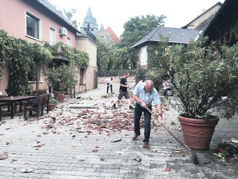 Vergangenen Dienstag flogen in Framersheim innerhalb weniger Minuten Dachziegel wie Blätter durch die Gegend, Bäume sind abgebrochen, Dachstühle eingestürzt, und ein hoher Sachschaden entstand an Gebäuden und Fahrzeugen. Zum Glück wurde keiner der knapp 1 600 Bewohner verletzt. Die Windhose zerstörte auch an das Dorf grenzende Weinberge und Äcker sowie eine Rebschule (großes Foto rechts von Dr. Hurtmanns), die in einer bestimmten Schneise lagen.