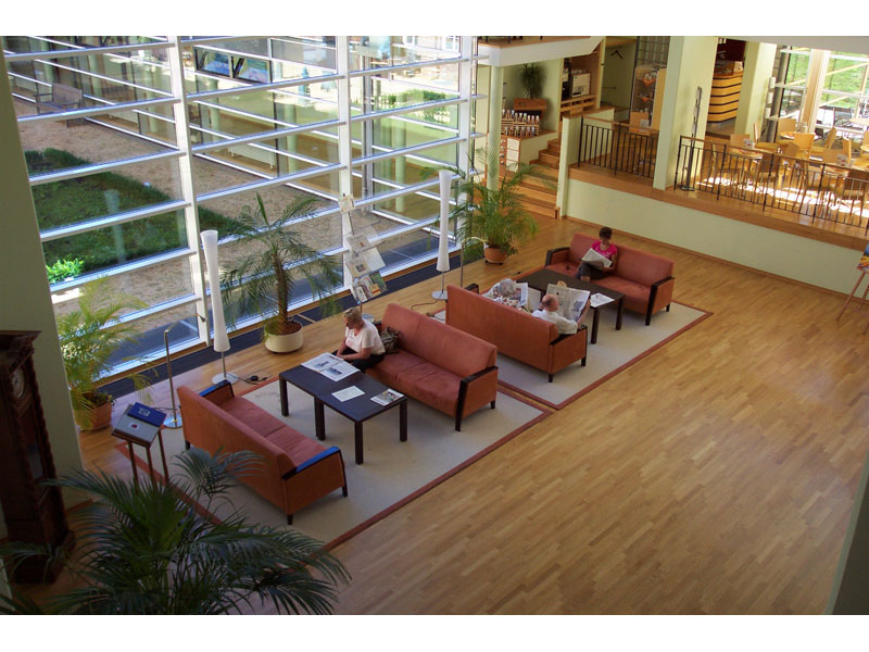 Das Foyer ist das Herzstück des Gästehauses. Im hinteren Teil befindet sich ein Café.