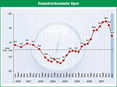 Das wirtschaftliche Klima in der deutschen Landwirtschaft hat sich stark eingetrübt. Laut dem jüngsten Konjunktur- und Investitionsbarometer Agrar stürzte dieser Index bei der Erhebung im Juli auf 19 Punkte ab, nach knapp 34 Zählern bei der letzten Befragung im Frühjahr. Gleichzeitig sank das Konjunkturbarometer damit auf den niedrigsten Stand seit Frühling 2006. In der Befragung fällt vor allem die Einschätzung der aktuellen wirtschaftlichen Lage über alle Betriebsformen hinweg stark ab.