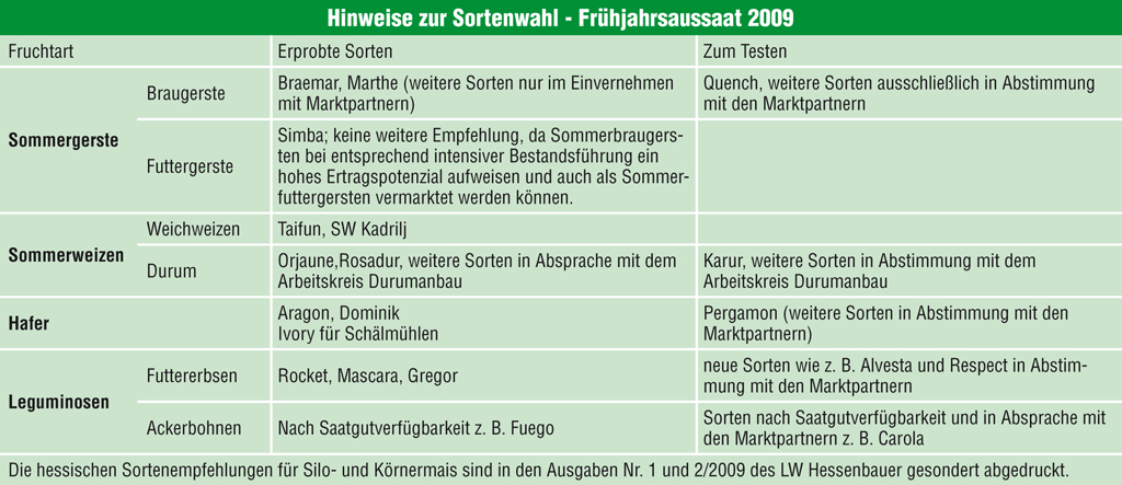 Um den hessischen Landwirten eine Hilfestellung bei der Sortenwahl zu geben, werden von der amtlichen Beratung, den VO-Firmen, den Vermehrern sowie der aufnehmenden Hand bei Getreide und Leguminosen Sorten für die Frühjahrsaussaat 2009 vorgeschlagen. Dabei wird in der nachfolgenden Tabelle differenziert nach „erprobten Sorten“ und Sorten „zum Testen“. Bei den Sortenempfehlungen wurden sowohl die in den hessischen Landesversuchen gewonnen Ergebnisse berücksichtigt als auch die mit den Sorten in der Praxis gemachten Erfahrungen. Daneben war wichtig, dass die Versorgung mit Z-Saatgut für die empfohlenen Sorten gesichert ist. und für die Ernteprodukte der angebauten Sorten Nachfrage bestehen wird.Bei der Sortenempfehlung konnten natürlich nicht alle regionalen Besonderheiten berücksichtigt werden, so dass in einzelnen Gebieten andere als die in den Tabellen genannten Sorten im Hinblick auf Marktanteile und Anbauumfang von Bedeutung sein können. Für weitergehende Informationen zu den in der Tabelle aufgeführten Sorten sowie für einzelne Beratungsgebiete wichtige Sorten stehen die Pflanzenproduktionsberater des Landesbetrieb Landwirtschaft Hessen zur Verfügung. Dr. Dieter Witzel, LLH