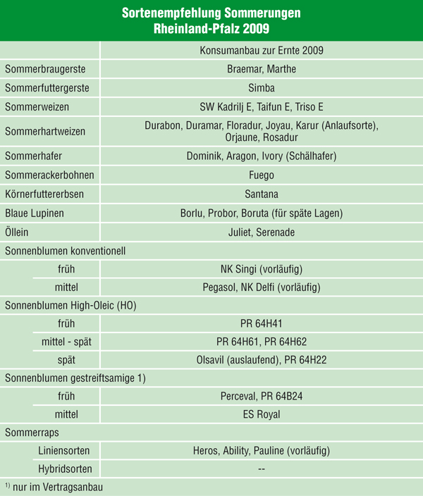 Die mehrjährigen Ergebnisse der Landessortenversuche aus Rheinland-Pfalz bildeten in Verbindung mit den Einschätzungen der Gesprächsteilnehmer über die Markt- und Absatzaussichten die Grundlage für die Sortenempfehlungen. Teilweise wurden auch die Ergebnisse aus den benachbarten Bundesländern für die Entscheidung herangezogen. Detaillierte Aussagen und Anbauempfehlungen erfolgen in den entsprechenden Fachbeiträgen.Für die Frühjahrsaussaat werden die in der Tabelle aufgeführten Sorten empfohlen. dlr
