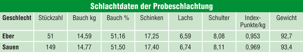 Die Erzeugergemeinschaft (EG) Rheinland hat an einem rheinischen Schlachtbetrieb probeweise eine Eberschlachtung durchgeführt. Angeliefert wurden aus einem spezialisierten Ebermastbetrieb aus den Niederlanden 51 Eber und 149 weibliche Schweine der Kreuzung Tempo-Eber x Topigs-20-Sau. Die Eber zeigten sich, nach der Anlieferung an dem Schlachtbetrieb äußerst mobil, legten sich kaum hin und untersuchten die Umgebung. Aufspringen wurde aber nur selten beobachtet.Die Ausschlachtung der Gesamtpartie lag bei 79,02 Prozent, die der Sauen bei 79,15 und die der Eber bei 78,6 Prozent. Das ist auch verständlich: An Hoden und Hodensack wurden pro Eber 1,28 kg weggeschnitten; bezogen auf das Lebendgewicht ist das ein Ausschlachtungsverlust von 1,08 Prozent. Auffällig im Vergleich zu Kastraten war bei dieser Partie die geringe Fetteinlagerung im Bauch. Die Ergebnisse der Probeschlachtung sind in der Tabelle zu sehen.