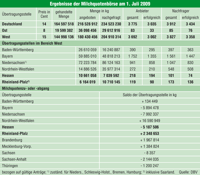 Im Übertragungsbereich West (siehe auch Seite M8), insbesondere in Nordrhein-Westfalen, sei ein leichter Nachfrageüberhang zu verzeichnen gewesen. Im Übertragungsbereich Ost war ein leichter Angebotsüberhang zu verzeichnen, so der DBV. Die Ergebnisse der einzelnen neuen Bundesländer zeigten, dass in Mecklenburg-Vorpommern und Brandenburg die Quotennachfrage über dem Angebot lag.