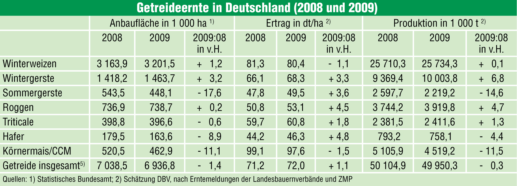 Ansatzpunkt für eine verbesserÂte Risikovorsorge sind neben der schwierigen Lage am Milchmarkt unter anderem die in die Knie gegangenen Notierungen für Marktfrüchte. Gegenüber dem entsprechenden VorjahresniÂveau sind die Erzeugerpreise für Brotweizen und Brotroggen SonnÂÂÂleitner zufolge um mehr als ein Drittel gefallen; bei BraugersÂte und Raps wurden sogar Abschläge von rund 45 Prozent reÂgisÂtriert. „Mit diesen Preisen wird die deutsche Braugerste verÂschwinÂden“, warnte Sonnleitner. Der Anbau von Sommergerste war zur diesjährigen Ernte um fast 18 Prozent auf 448 100 ha einÂgeschränkt worden und war damit das einzige wichtige GetreiÂde, dessen Areal nicht ausgedehnt wurde. Hingegen hatten sich die Bauern auf 3,20 Mio. ha für WinÂterweizen entschieden; das waren 1,2 Prozent mehr als zur Ernte 2008. Aufgrund von leichten Ertragsrückgängen um 1,1 Prozent auf 80,4 dt/ha erhöhte sich die Erntemenge laut DBV-Schätzung aber nur leicht. Die RekordÂproduktion an Wintergerste war hingegen sowohl von einer FläÂchenÂausweitung um 3,2 Prozent auf 1,46 Mio. ha wie auch von einer Ertragssteigerung um 3,3 Prozent auf 68,3 dt/ha getragen. Das galt auch für den Raps, wo eine Verbesserung des FläÂchenÂerÂgebÂnisses um 8,3 Prozent auf 40,8 dt/ha ebenso zu der SpitÂzenÂernte beitrug wie eine Vergrößerung des Anbauareals um 6,5 Prozent auf 1,45 Mio ha.