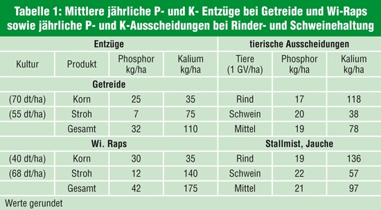 Welche Mengen an K-Mineraldünger unter den Bedingungen der K-Gehaltsklasse C noch zu verabfolgen sind, hängt vor allem auch von der Zufuhr von Wirtschaftsdüngern ab (Tabelle 1). So werden zum Beispiel mit einer angenommenen Ernte von rund 70dt/ha Getreidekorn etwa 25 kg P/ha und 35 kg K/ha vom Feld abgefahren, wenn das Stroh auf dem Feld verbleibt. In vergleichbarer Höhe liegen die Nährstoffentzüge für den Rapsertrag. Nur diese Nährstoffmengen gilt es im Sinne nachhaltiger Bodenfruchtbarkeit zu ersetzen.
