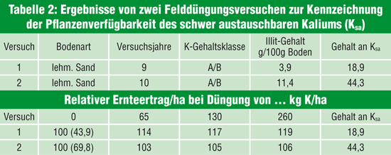 Aber auch das schweraustauschbare Zwischenschicht- K kann man erfassen. Durch einen Vergleich der Ergebnisse von zwei mehrjährigen Feldversuchen zur K-Düngung mit sonst weitgehend gleichen Boden- und Bewirtschaftungsbedingungen lässt sich zeigen, dass der Ksa-Gehalt des Bodens für die Pflanzenernährung von Bedeutung ist (Tabelle 2). Trotz niedriger K-Gehalte an leicht austauschbarem Kalium im Versuch 2 (DL-lösliches K) bewirkt eine K-Düngung nur geringe Mehrerträge, da in Folge hoher Gehalte an Ksa eine erhebliche K-Nachlieferung zur ausreichenden Deckung des K-Bedarfs beitrug.