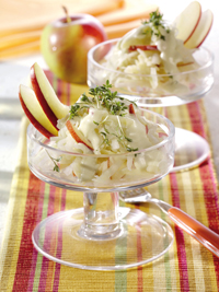 Der Apfel-Kohlrabi-Salat wird vor dem Anrichten mit Apfelscheiben und Kresse garniert.