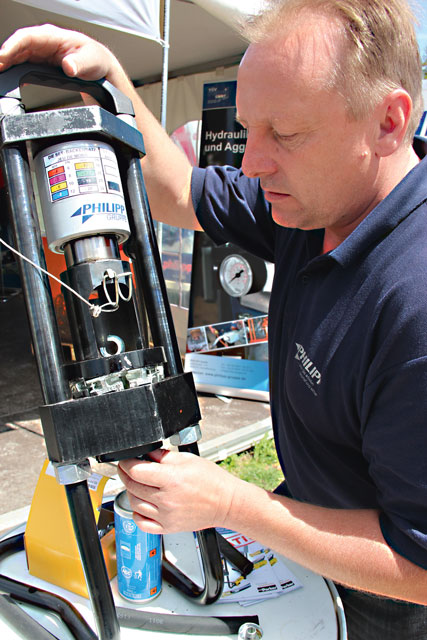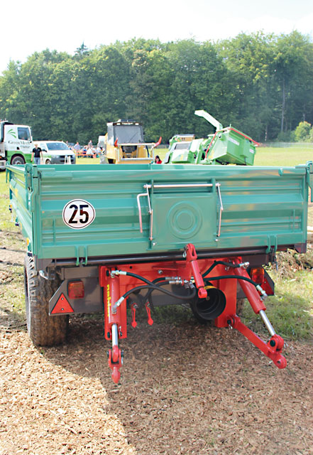 Eine praktische Idee setzte die Firma Oehler Maschinenbau aus Offenburg um: Der Zapfwellenbetrieb wurde um den Anhänger verlängert und eine Drei-Punkthydraulik an den Anhänger gebaut, so können Gerätschaften, wie Spalter oder Kreissäge direkt an Ort und Stelle in Betrieb genommen werden. Transport und Inbetriebnahme seien vereint, sagte Harald Gerstenberger von Oehler.