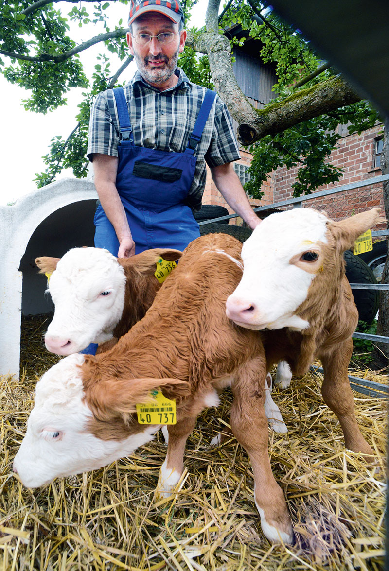 Putzmunter sind die Drillingskälber Emma, Pia und Michael, die auf dem Betrieb der Familie von Richard (im Bild) und Hiltrud Hahn in Burghaun-Steinbach zur Welt gekommen sind. Wenngleich die Geburt von Drillingen bei Kühen an sich schon selten ist, so vervollstänÂdigte das Glück hier noch die Tatsache, dass diese von ihrer MutterÂkuh Sonja der Rasse Fleckvieh völlig problemlos geboren wurden. Vor seinem Frühstück nahm der Landwirt nochmals wachsam die Mutterkuh in Augenschein, als er zurückkam, hatte sie bereits gekalbt. Da war die Freude über den gesunden und fit einher schauenÂden Stallnachwuchs riesengroß. Auf dessen Entwicklung wird man gespannt sein. Ihr Vater ist der Vererber „Washington“. Nach Informationen des Landesbetriebes Landwirtschaft Hessen ereignet sich eine Zwillingsgeburt bei etwa zwei bis drei Prozent aller Abkalbungen und ist außerdem abhängig von der Rinderrasse. Die Wahrscheinlichkeit für Drillingsgeburten liegt dagegen nur bei circa 7 von 1 000 Kalbungen. In Hessen kommen jährlich nur etwa ein Dutzend Drillingskälber zur Welt. Karl-Heinz Burkhardt